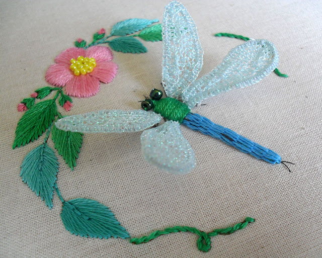 | DMC Dragonfly Kit (slightly adapted from the original). See the WIP photos, tutorial on padded raised stem stitch band (the turquoise bit), and how to put the whole thing together. |