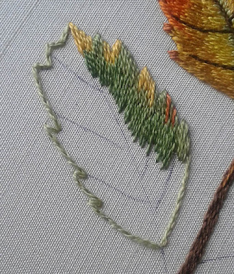 The next day, I had to go and visit my mum in hospital and picked up a yellow and dark orange leaf of a similar type to the ones I was working as a colour and shading reference. (My well-informed-on-nature friend, Emily, helped me to identify beech leaves as a possible type.) As you can see from the outlined first leaf below, I'd woefully missed the mark when it came to how bright the colours needed to be! Back to the Madeira Silk thread drawer and out came some much more vibrant shades to work with.