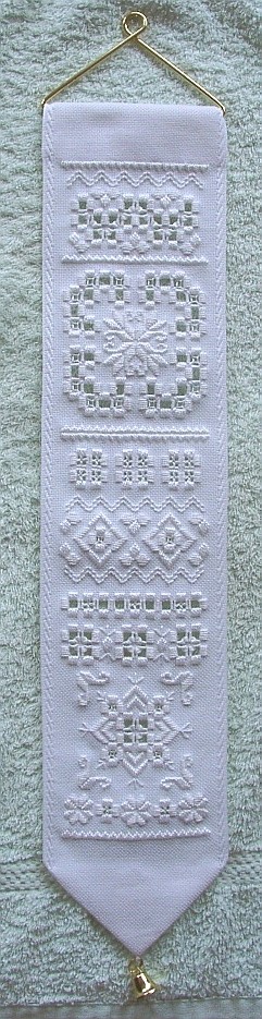 Here it is, completed and finished into a bellpull. The bellpull ends that I had to order were far too big and I then found that I had this odd end in my stash. Actually, it was the other half of the one used on the wedding bellpull. On that one, I just used the top end and so had the bottom one, complete with tinkling little bell, left over. DH kindly took the bell off the hanger for me, leaving the bell intact so that I could attach it to the bottom. I'm very pleased with the effect. What do you think? Click on the photo for the full sized version and more detail.